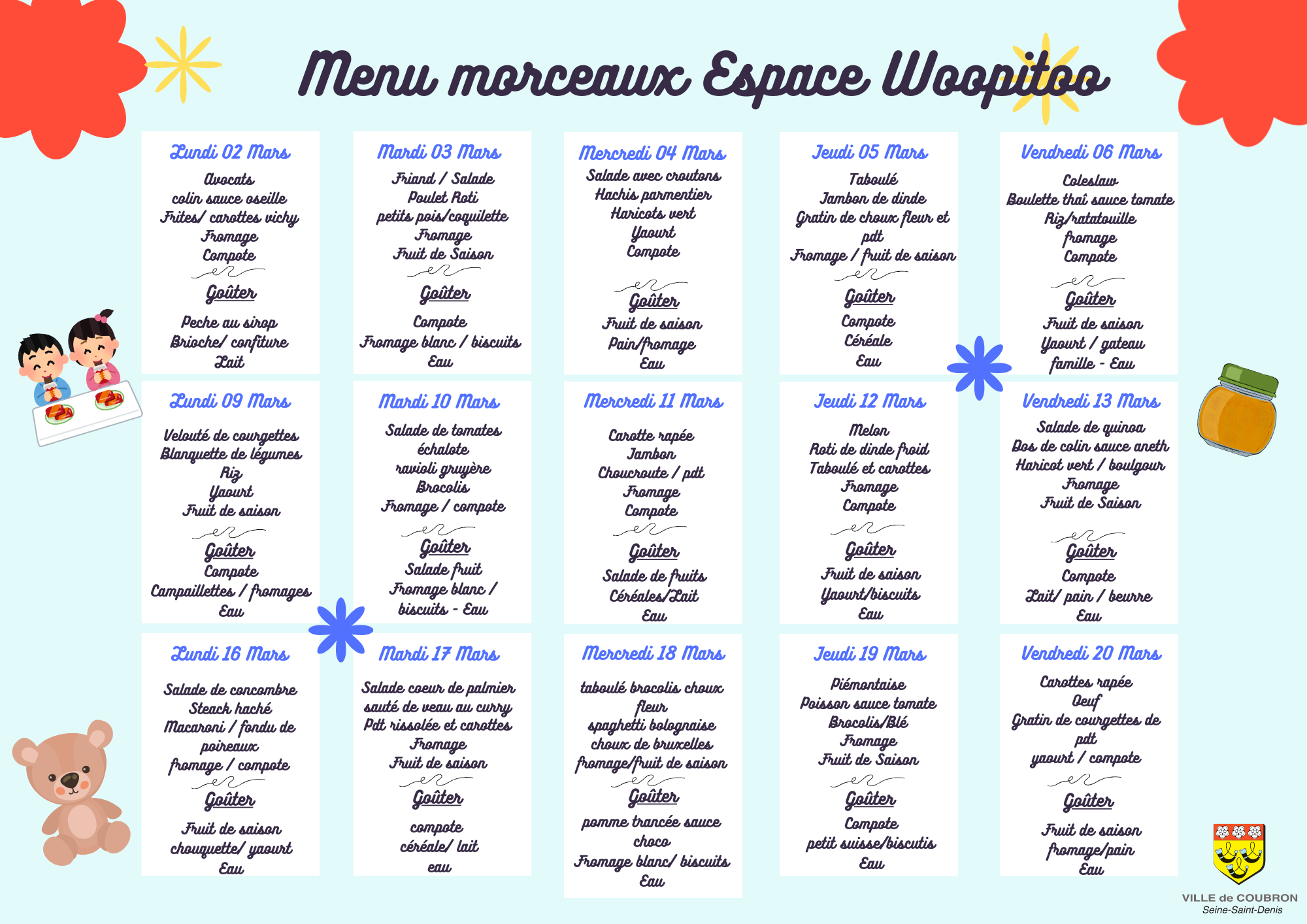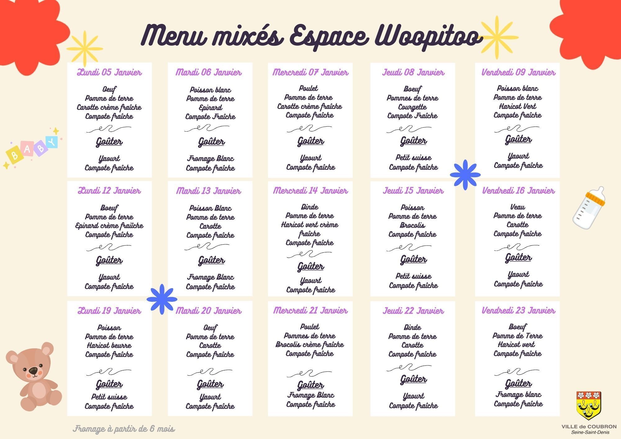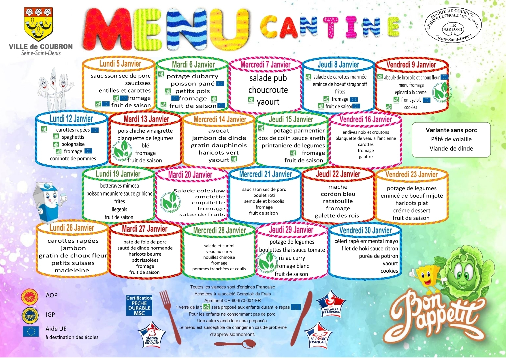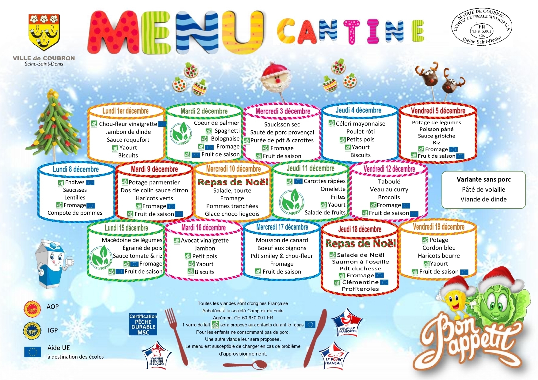 Chaque semaine les menus de la semaine sont élaborés selon les règles de diététique et d'hygiène alimentaire.