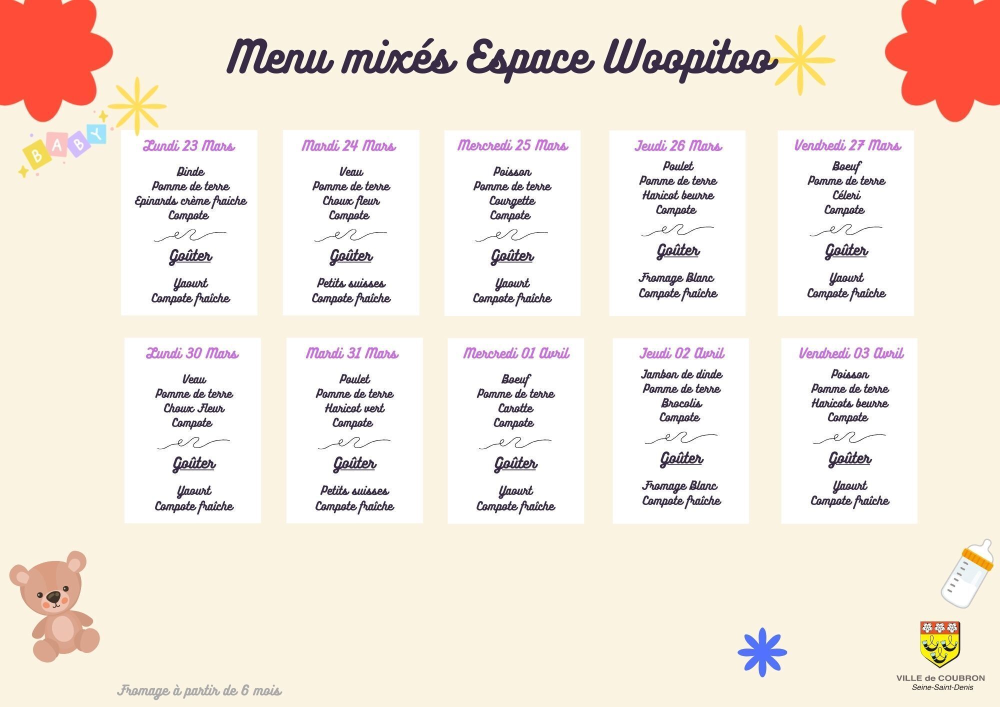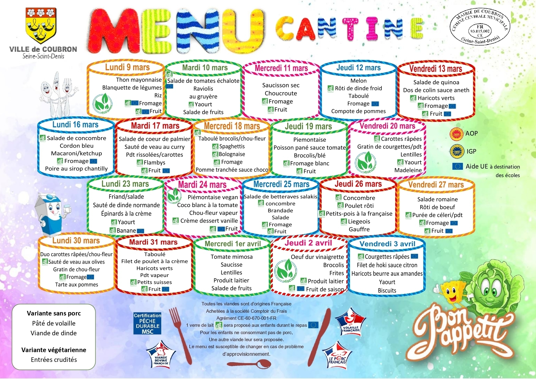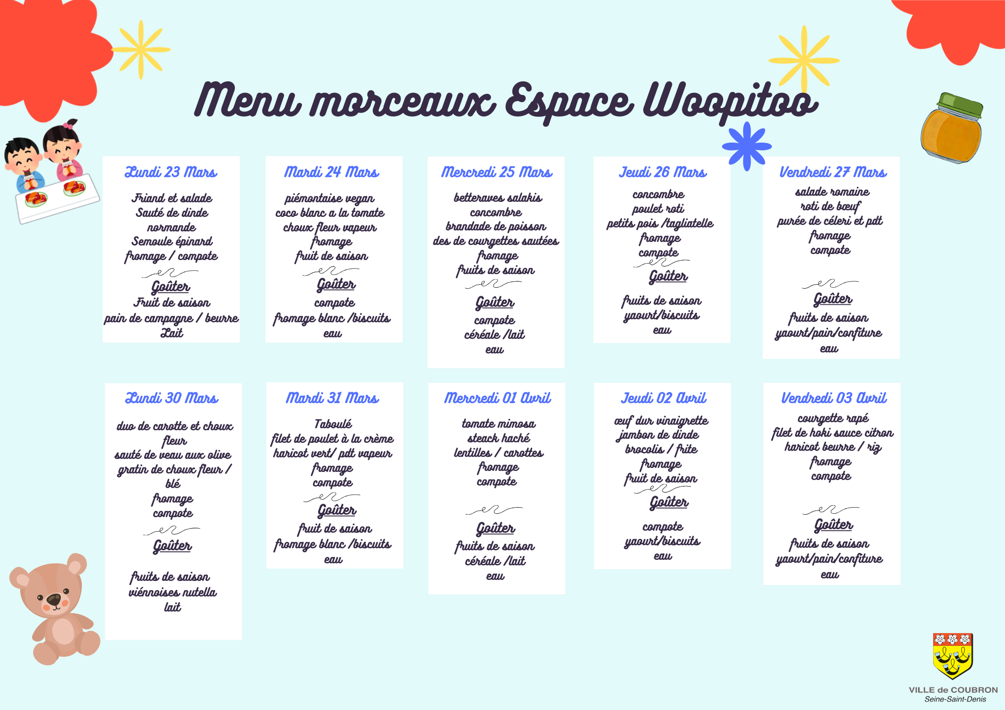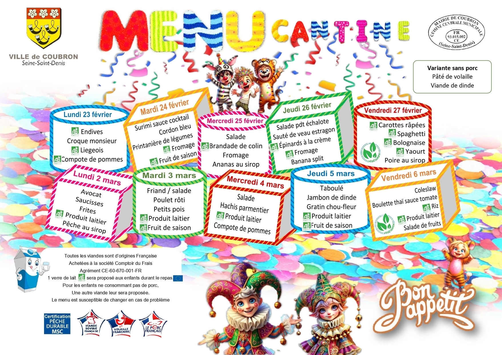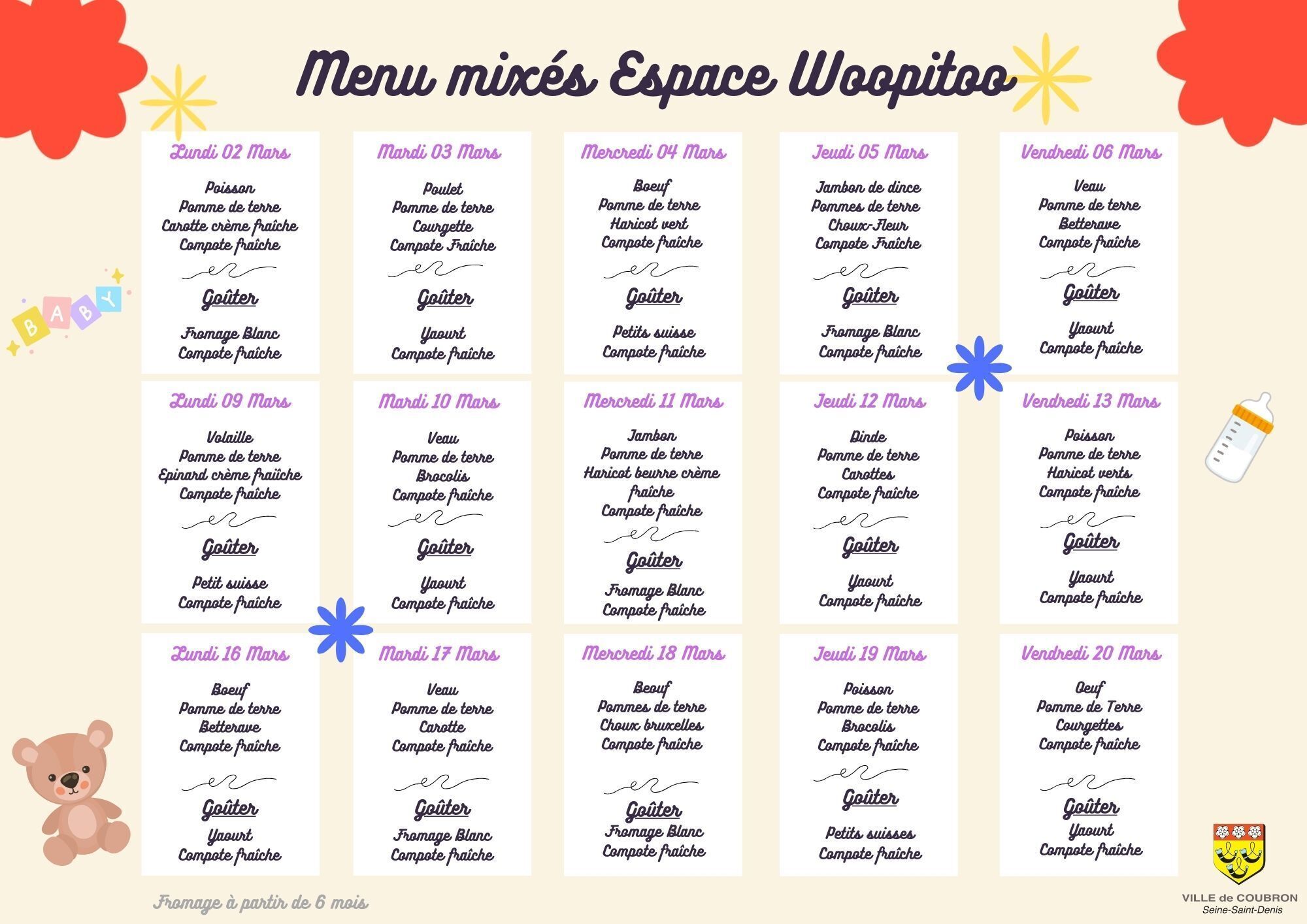 Chaque semaine les menus de la semaine sont élaborés selon les règles de diététique et d'hygiène alimentaire.